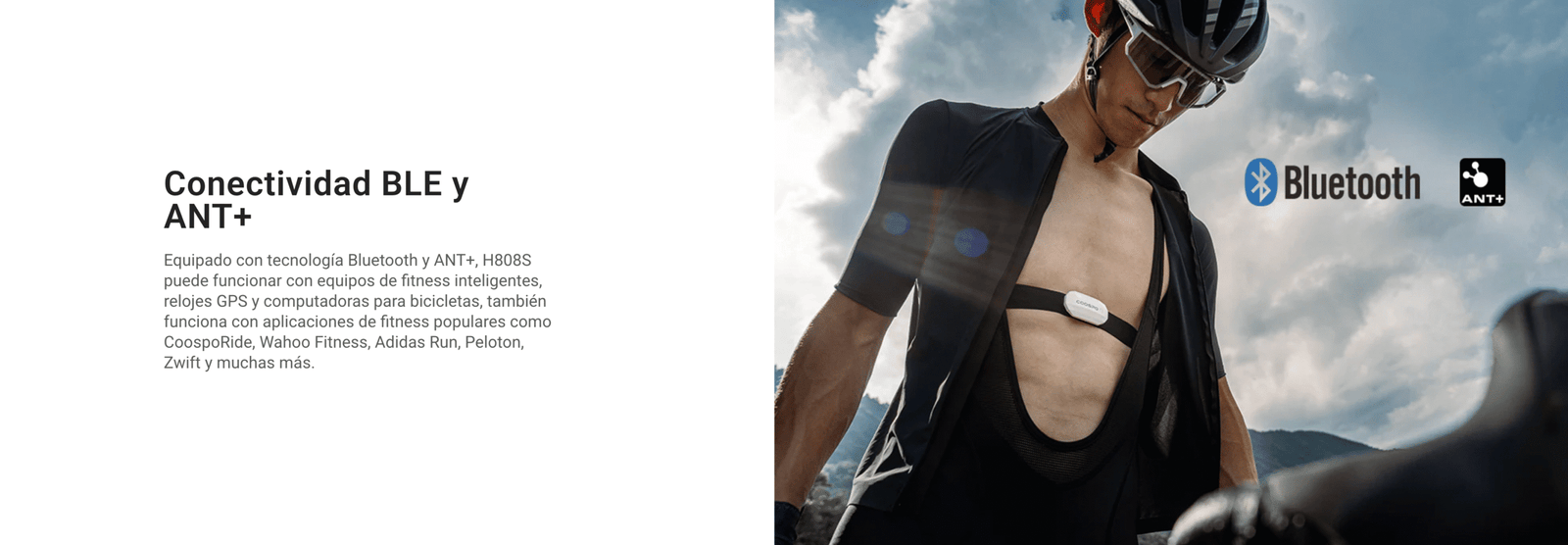 El H808S es un sensor de frecuencia cardíaca con banda pectoral ideal que se conecta a varios dispositivos de entrenamiento Bluetooth y ANT+. Con monitorización de frecuencia cardíaca en tiempo real, el H808S te ayuda a ajustar la intensidad del ejercicio y a mantener un buen estado de entrenamiento durante cualquier actividad o entrenamiento. Con el H808S en el pecho, un entrenamiento más saludable, activo y conectado está a tu alcance.